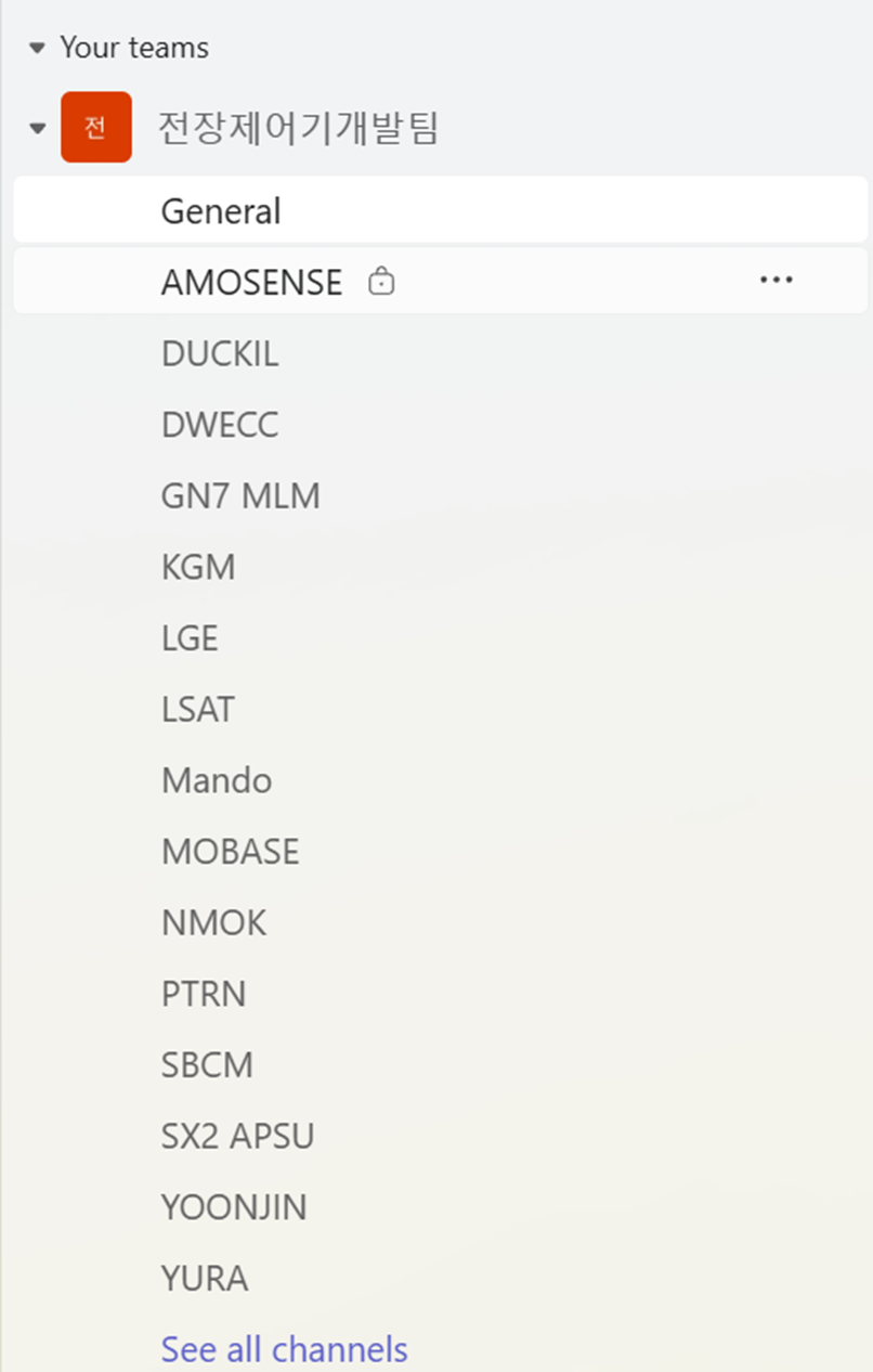 Teams Windows Application을 실행 후 왼쪽 탭에서 Teams를 선택하고 나서 전장제어기개발팀의 General에 들어간다.