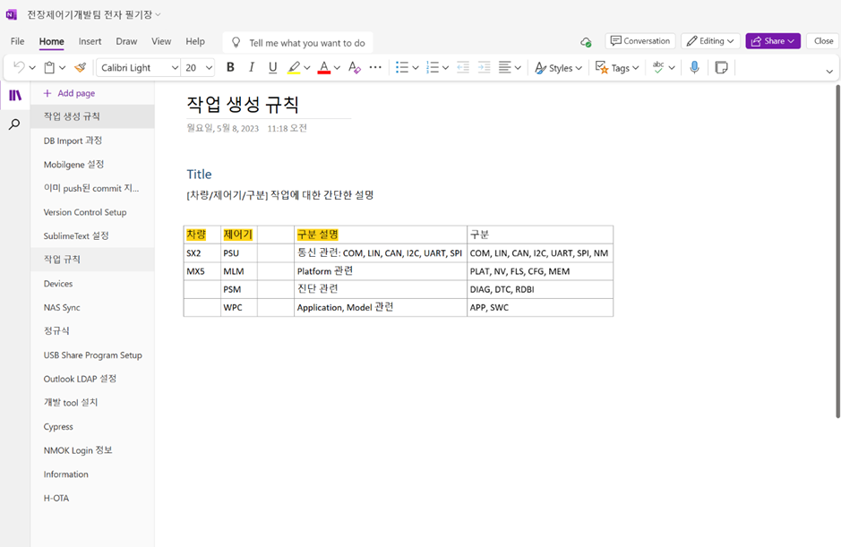 전장제어기개발팀+전자 필기장 탭을 클릭하면, 위의 그림과 같이 회사 내부의 전장제어기개발팀에 있는 모든 사람이 공유하는 One Note 창이 표시된다.